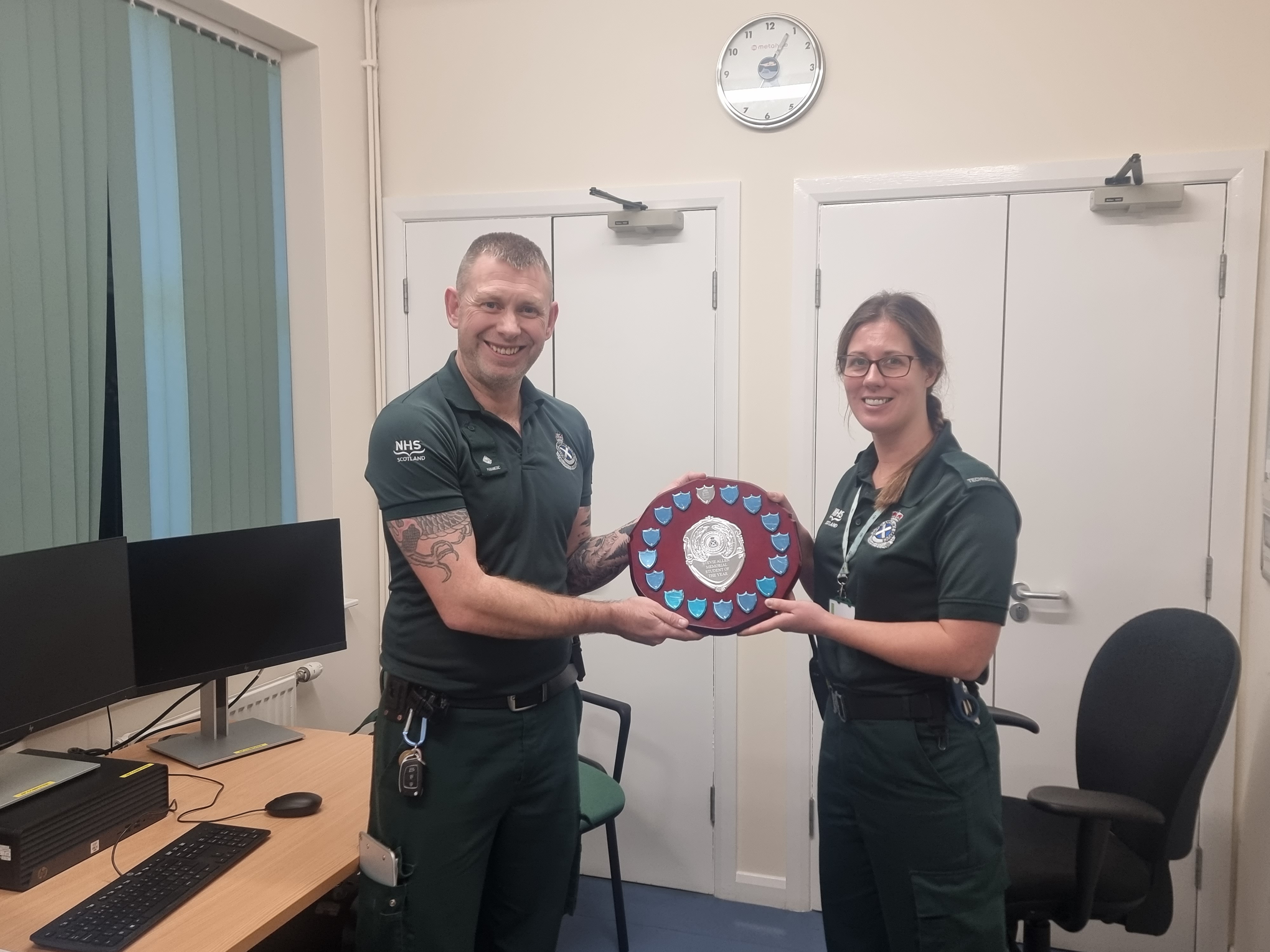 Local staff from across the Borders voted with three shortlisted finalists chosen. Jacques Kerr, his partner, recently visited Hawick to launch the award and thank staff for their support. The winner was Dawn Scott, who was unable to attend but was later presented with the trophy by Lee Myers, Paramedic Clinical Team Leader at Hawick.